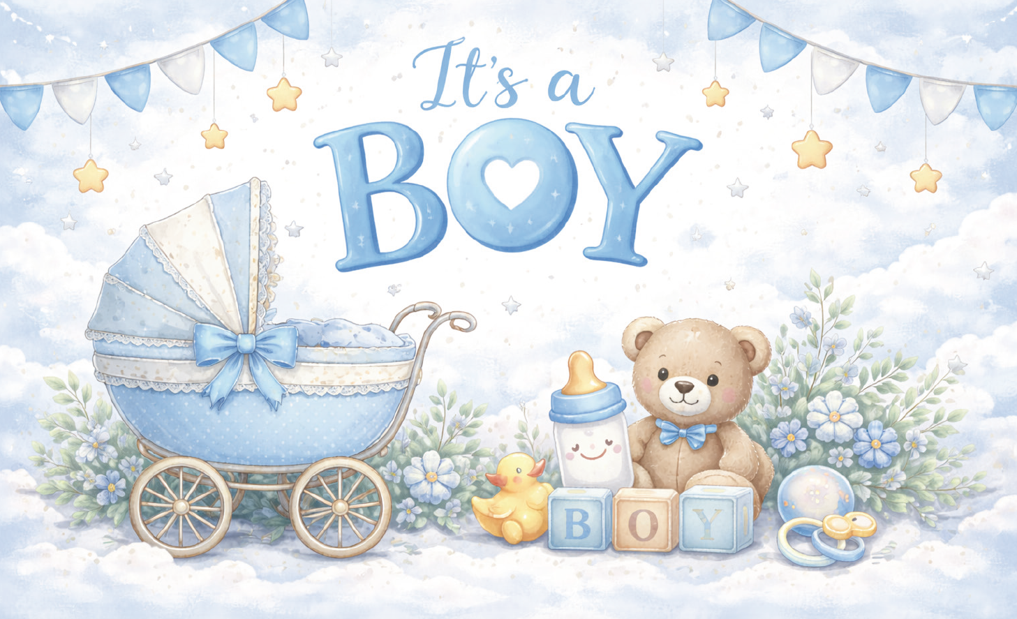 The "It's a Boy" flag is the perfect decoration for the birth of a boy or a stylish baby shower. Designed in soft shades of blue and lovingly illustrated with a nostalgic pram, teddy bear, baby bottle, and playful details, it creates a warm, festive atmosphere.
