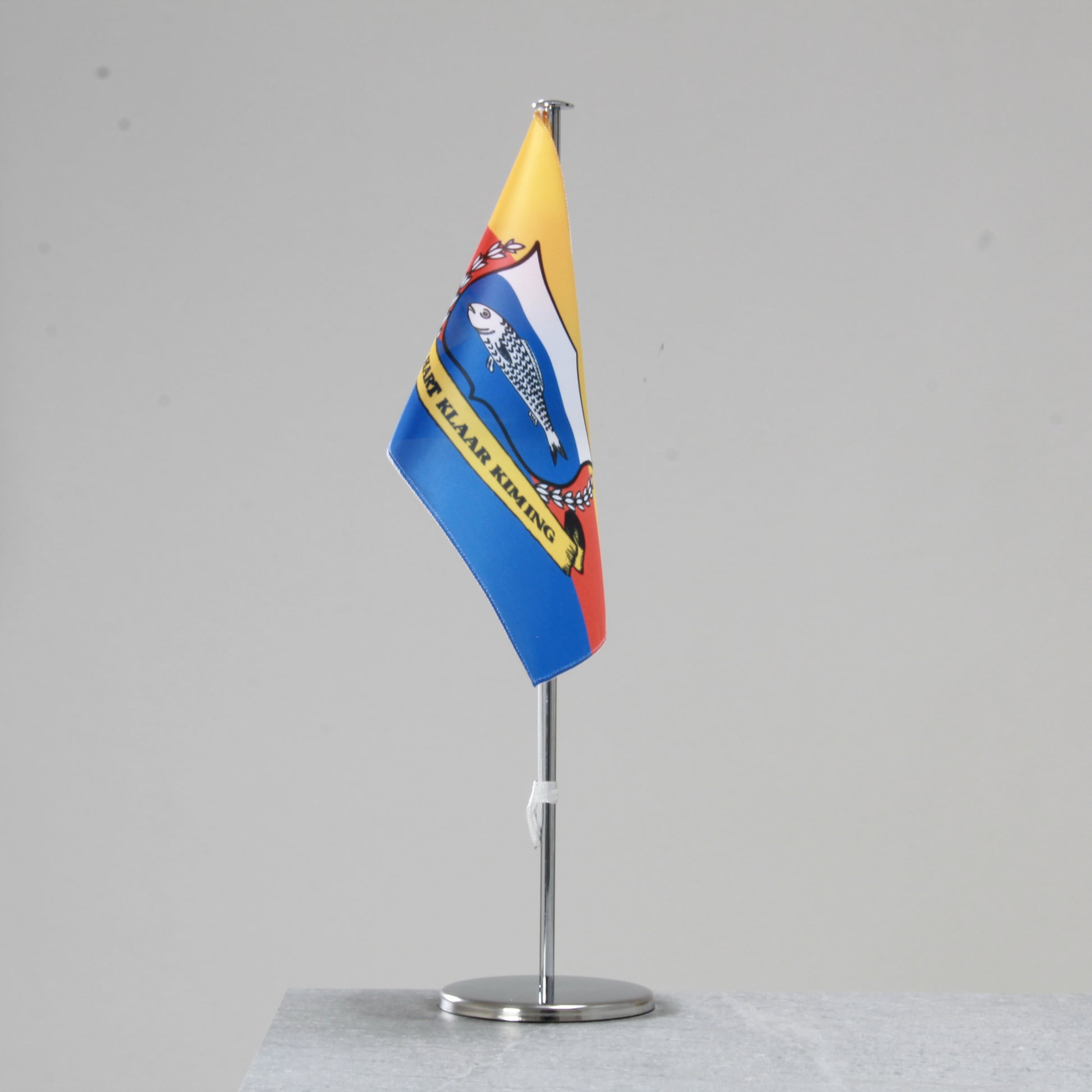 Die Fahne wird an einem eleganten Ständer aus Chrom oder Holz befestigt (je nach Auswahl) und überzeugt durch eine saubere Verarbeitung sowie detailgetreue, farbintensive Darstellung. Ob als Ausdruck friesischer Verbundenheit, dekoratives Element oder für kulturelle Anlässe – diese Tischfahne setzt ein klares Zeichen regionaler Identität.